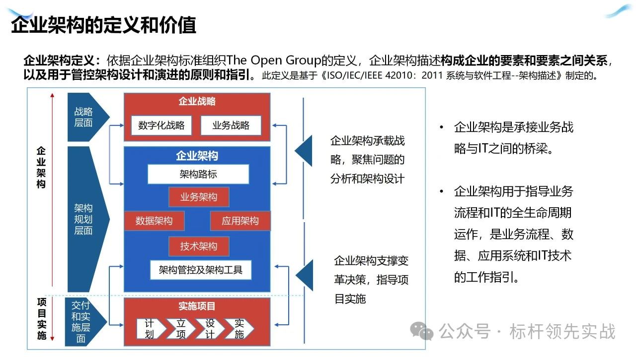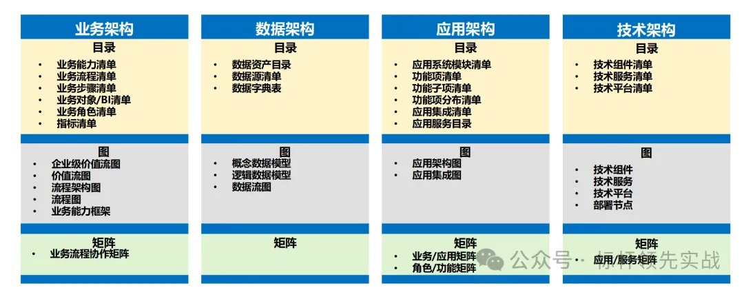 包括业务架构、数据架构、应用架构和技术架构的设计和管控方法。