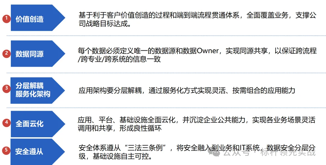 - 强调数据同源、分层解耦、服务化架构、全面云化和安全遵从。