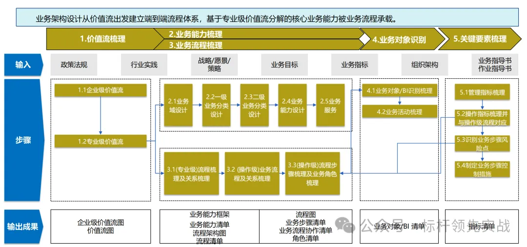 - 业务能力梳理:基于专业级价值流分解的核心业务能力被业务流程承载。