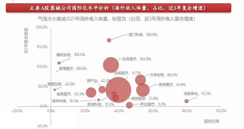 其中疫情三年,国产器械的性价比得到全球认可,加速出海渠道扩张,未来高端产品有望实现出海。近年来国产器械龙头不断推行国际化战略,目前国际化率普遍在30%-40%,从增速看,近三年复合增速平均在50%左右(部分公司有疫情增量)。相关个股包括迈瑞医疗、联影医疗、华大智造、新产业、普门科技、南微医学、惠泰医疗、澳华内镜、开立医疗、海泰新光、振德医疗、理邦仪器、祥生医疗、福瑞股份、怡和嘉业、美好医疗、微创医疗、微创机器人、启明医疗、先瑞达医疗等。