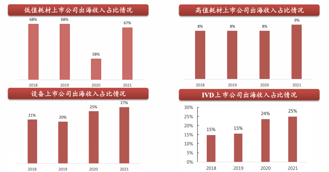 国内器械企业凭借对海外法规和销售模式的理解,叠加产品技术水平提升和性价比突出,国内企业出海水到渠成。从目前看,国内器械出海已经初见成果,出海比例从高到低分别为:低值耗材>设备>IVD>高值耗材。数字化转型网www.szhzxw.cn