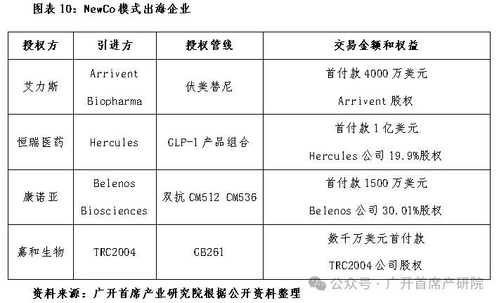 二是“合作出海”将朝着更加多元的方向发展。近年来,越来越多的国内制药巨头也参与到出海的热潮中。相较于Biotech主要为解决资金压力,大型药企则更希望以“合作出海”的方式,在解决海外商业化能力不足的同时,更大程度的参与到海外商业化体系建设中。恒瑞医药的NewCo模式(即将公司核心产品的海外权利授权给海外成立的新公司,同时引入海外基金,搭建国际化管理团队)为创新药企业出海打开新的思路。2024年5月,恒瑞医药将CLP-1产品组合许可给Hercules,除首付款、后续里程碑付款和销售分成外,恒瑞还获得19.9%的Hercules股东权益。NewCo模式在一定程度上保留了相当比例本土企业在海外权益;而海外的管理运营团队在临床、审批上市、商业化等方面的路径更加清晰,推动核心项目进展的确定性较高。实际上,越来越多的企业开始探索“合作出海”的新模式,截止2024年8月,已有四家本土企业采取NewCo的模式出海。相较于传统的对外授权模式,新的模式在资源整合、风险共担、市场准入、资本使用效率等诸多方面展现出优势,伴随着出海成熟度的不断提升,未来创新药出海的模式将呈现更加多元化的态势。