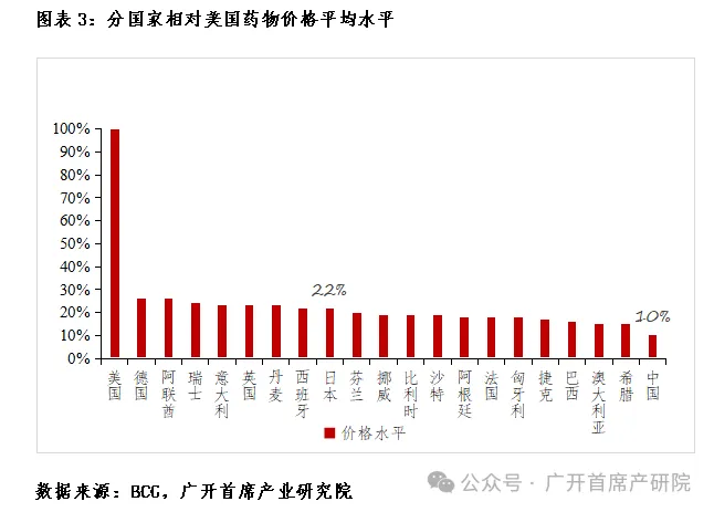 二是本土支付能力有限,倒逼企业拓展新市场。我国在人均医疗支出水平、医保支付体系等方面与发达国家存在较大差距,整体上国内创新药市场规模相对有限。2022年,医保对创新药支出481.89亿元(2019年59.49亿元),仅占当年医保支出的1.96%。而据美国国家卫生健康费用(NHE)数据,2022年美国药品费用支出约5800亿美元,占医疗总支出的13%,其中80%的费用支出均来自于创新药。除支付能力不足外,国内创新药定价机制尚不完善,药物平均价格在全球范围内处于较低水平。从全球前25畅销药的平均相对价格来看,中国药品价格仅为美国的1/10,欧洲国家的1/2左右。2023年10月27日在美获批的中国本土创新药特瑞普利单抗,其在美售价每瓶8892.03美元,是该药物(同规格)在中国的33倍。和黄医药的抗肿瘤新药呋喹替尼,美国价格也达到了中国价格的24倍。