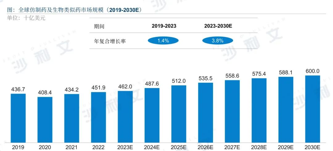 随着慢性病、糖尿病和心血管疾病的患病率不断上升,老年人口不断增加,医疗保健支出不断增加,对仿制药的高需求和大量专利到期的专利药均在促进着仿制药市场的发展。仿制药行业已经进入相对稳定发展的状态,沙利文数据显示,2019年至2023年,全球仿制药及生物类似药的市场规模以1.4%的复合增长率从4,367亿美元扩大至4,620亿美元,未来增长趋势将延续,预计2026年和2030年将分别达到5,355和6,000亿美元。数字化转型网www.szhzxw.cn