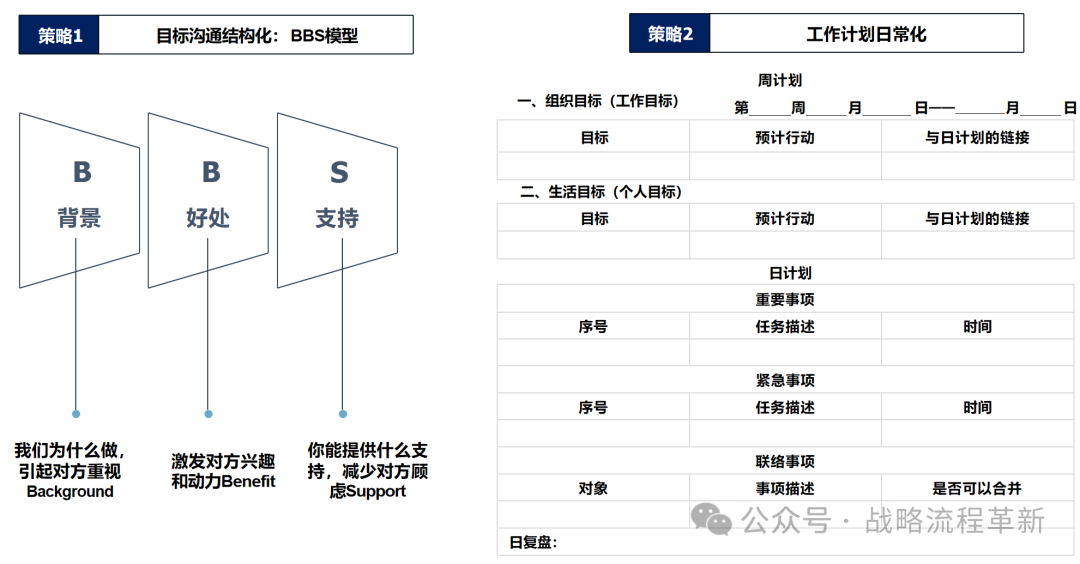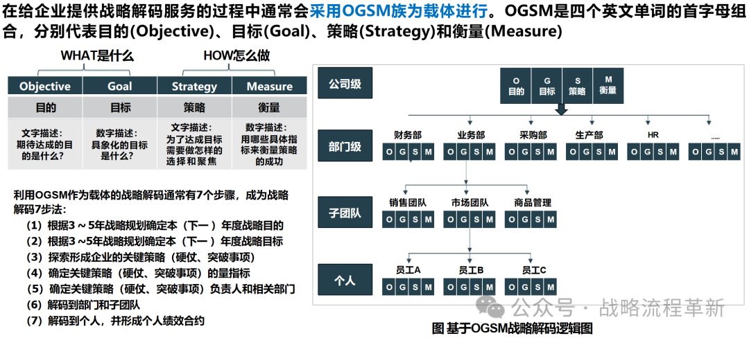 - OGSM模型:将战略目标分解为具体的目的(Objectives)、目标(Goals)、策略(Strategies)和衡量指标(Measures)。