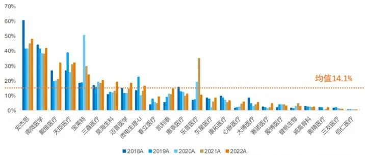 根据2022年年报披露的高值耗材上市公司海外业务收入,平均占比达到14.1%,大量公司海外业务仍处于起步阶段。数字化转型网www.szhzxw.cn