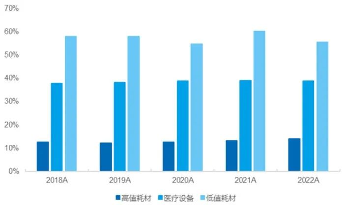 总体来说,类目上,医疗器械三大板块企业海外业务收入占比,低值耗材>医疗设备>高值设备。2022 年低值耗材海外业务收入占比平均为 55.4%,医疗设备达到 38.8%,高值耗材则为 14.1%。