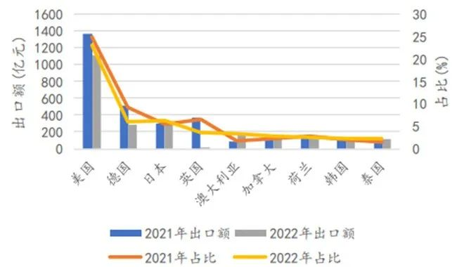 据《中国医疗器械行业发展报告》数据,2022年美国仍为中国最大的医疗器械出口市场,2022年美国出口额1115.51亿元,占比23.18%。
