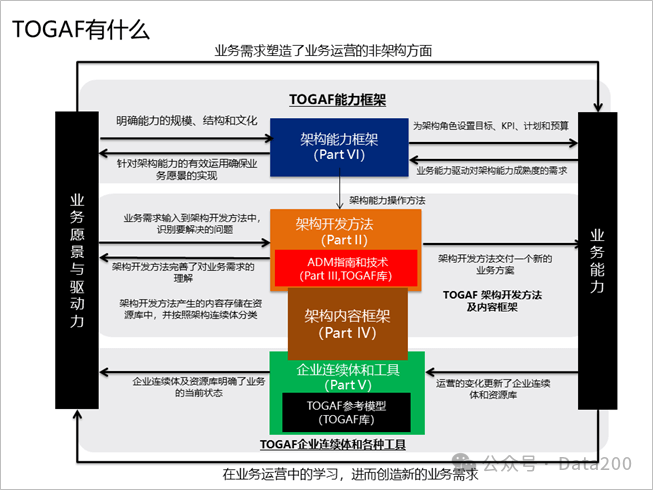 TOGAF涵盖了整个企业架构生命周期,从架构愿景、业务架构、数据架构、应用架构,到技术架构逐层展开,提供了完整的架构内容框架。同时它本身并不约束具体的建模方法和工具,架构师可根据实际需要灵活引入。数字化转型网www.szhzxw.cn