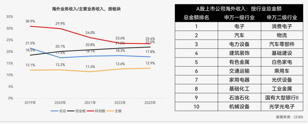 从A股上市的公司中,科创板企业的海外业务收入占主营业务的比例排在第一,这主要因为科创板企业所具备的高技术含量和创新能力,这使得它们在全球市场上具备了强大的竞争力。从A股上市公司海外收入排名来看,前30的企业主要集中在电子、汽车等行业。数字化转型网www.szhzxw.cn