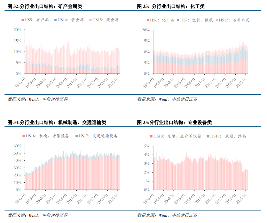 2、中长期视角看,随着我国优势产业开拓海外增量市场的步伐加速,全球份额占比提升有望带动其业绩中枢和估值逻辑的重塑,关注新能源车产业链、创新药、通信设备、光伏设备、精细化工品等。宏观产业层面看,纵观1996年以来近30年的出口历程,以化工类、机械制造类为代表的制造业占比不断提升,交通运输设备行业近年来占比增长迅猛。中观角度看,通过计算各行业出口额占全球总进口额比重、梳理各咨询机构统计的各行业海外市场份额数据,我们衡量我国制造业全球竞争力曲线,目前可分为三个等级:1)尚依赖进口、但正加速国产替代的行业,以集成电路、机器人、航空装备、医疗器械、汽车零部件等为代表;2)今年竞争力提升、开拓出海市场的行业,以电动乘用车、光伏设备、通信设备等为代表,目前已形成较明显的出口竞争优势,正在积极兑现出海逻辑;3)海外具备竞争力、已经出海的行业,以白色家电、显示器件、消费电子等为主。微观角度看,进一步梳理各行业及上市公司海外收入占比,作为衡量制造业出口竞争力的第三个视角,可以大致分为几类:1)出口竞争力强且上升:电子、逆变器,娱乐用品,纺织服装设备,模拟芯片设计、消费电子、面板、印制电路板;2) 出口竞争力强且保持,家用电器(冰洗、空调、小家电)等;3)此前出口竞争力相对较低但近年明显上升,主要集中在机械设备、汽车、基础化工板块,其中涤纶、氯碱,商用载客车、商用载货车、乘用车,化妆品竞争力上行幅度靠前。
