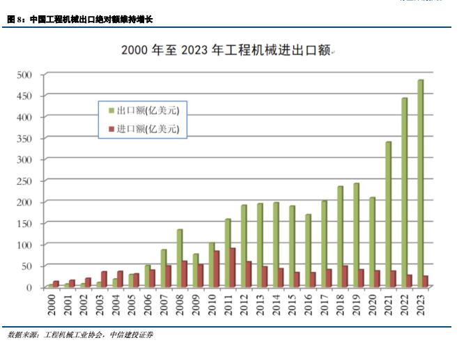 从中国工程机械出口来看,中国工程机械竞争力凸显,出口持续增长。虽然全球市场在2021年的高速增长后有所回落,我国工程机械出口在2021-2022年连续两年大幅增长的基础上,2023年继续在高位保持稳定增长态势,出口金额达到创纪录的486亿美元,主要系国内工程机械的竞争力不断增强,在海外份额不断提升。数字化转型网www.szhzxw.cn