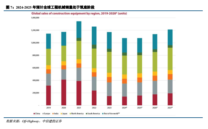 从全球工程机械需求来看,2024-2025年预计处于底部阶段,各地区表现有所分化。根据Off-Highway预测,2024年全球市场预计将同比下滑约8%。具体分地区来看,中国市场预计下滑约4%,处于触底阶段,预计2025年开始恢复增长;欧洲市场预计下滑约6%,印度市场短期受大选影响下滑约10%,中长期增长预计持续;受益于基建以及制造业回流带来的建设需求,北美市场仍将维持在高位;南美市场在经历2023年的大幅下滑后今年有望恢复,预计增长约3%。