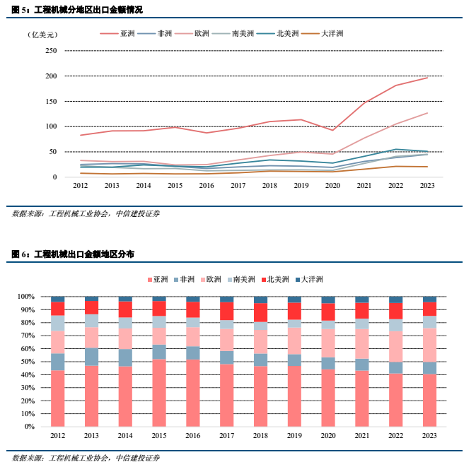 出海客户:工程机械产品主要应用于基建、地产等建筑工程建设以及矿山开采等领域,主要客户也为建筑、矿山等企业,国内工程机械经历了从“被动出海”到“主动出海”的转变,过去跟随国内对外承包工程进行“被动出海”,出口地区集中在“一带一路”地区,但随着国内工程机械竞争力的不断增强,目前工程机械出口更偏向于主动出海,出口地区分布更加多元化,发达地区比如北美洲、欧洲地区的出口金额不断增加,近年来,欧美地区占比总体有所提升。数字化转型网www.szhzxw.cn