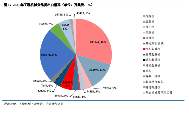 出海产品方面,工程机械行业各大核心产品土方机械、起重机械、混凝土机械、矿山机械、工业车辆等均有不同程度的出口,其中挖掘机、叉车、装载机出口金额较大,出口位列前三,根据工程机械工业协会统计,2023年出口金额分别为83.19、68.65、36.26亿美元,挖掘机和装载机均属于土方机械,全球市场空间较大,国内企业布局较为成熟,叉车属于工业车辆,目前锂电化趋势明确,国内企业在锂电化布局上具有优势。