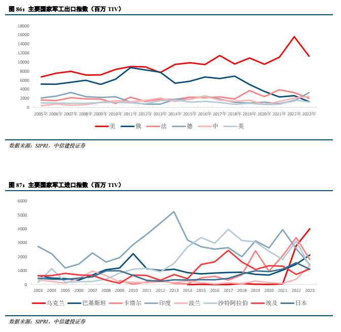 2023年,全球5大武器出口国是美国、德国、中国、法国和俄罗斯,占世界武器出口总量的70%,集中度略有下滑,主要系俄乌冲突后俄罗斯武器出口数量下滑明显。2023年,全球5大武器进口国是乌克兰、巴基斯坦、卡塔尔、印度、波兰,占世界武器进口总量的37%;乌克兰在俄乌冲突开始后武器进口量大幅提升,从2021年的46 TIV提升到2023年的4012 TIV;此前沙特阿拉伯、埃及、日本等国为全球武器进口主要国。世界25大主战武器出口国占到世界主战武器出口总量的98%。数字化转型网www.szhzxw.cn