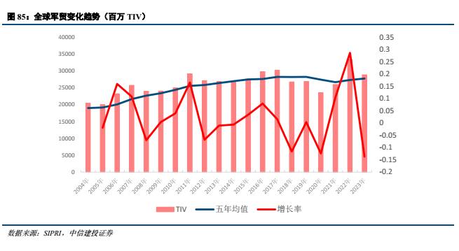 我国军贸产品在国际市场上的竞争优势正在不断提升。经过几十年的艰苦奋斗,中国军工行业已基本具备“内循环”的技术基础和物质条件,未来10到15年将是武器装备建设的收获期和井喷期。“十四五”时期,供给侧与需求侧的变化正有力支撑着行业高景气发展,经过多年的研发投入,我国军工产品部分已经达到国际技术先进水平,军工生产体系建设完备,具备自主可控的能力,产能得到有效扩张,生产流程和效率逐步优化,具备了大规模出口的供给侧条件。当前国际军贸市场对于“质美价优”的高科技武器装备需求日益旺盛,中国军贸国际竞争力正在不断提升。