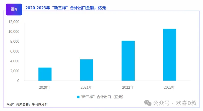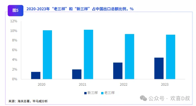 中国外贸出口的“中坚力量”由“老三样” (服装、家电和家具)稳定占据。据海关总署数据显示自2020年至2023年,“老三样”一直占据中国出口总额的约9%。与此同时,作为近年来中国工业领域的快速崛起之星,“新三样” (电动载人汽车、锂离子蓄电池、太阳能电池)正展现出惊人的发展“加速度”。2023年,“新三样”产品的合计出口额达到约1.06万亿元,首次突破了万亿元大关,并实现了29.8%的同比增长。