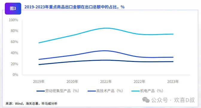 同时,中国制造业出口产品结构持续优化,由劳动密集型产品为主向技术密集型产品为主导转型。伴随国内制造业不断转型升级,中国的机电产品和高技术产品出口占比快速上升,其中机电产品出口占比从2019年占比58.6%跃升至2023年占比74.4%,高技术产品出口占比围绕30%上下小幅波动。而劳动密集型产品占比持续下降,2023年劳动密集型产品出口金额占当年出口总额的24.2%。数字化转型网www.szhzxw.cn