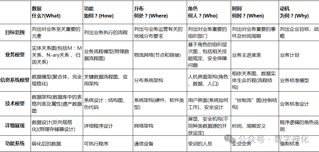 正如Zachman框架官网所强调的,该框架是一套元模型,而不是实施方法论。它给出的是企业架构内容的描述和分类,确保每个干系人的每个关注点都被照顾到、并有效地串联成一个完整的体系,提供了一种有效分解复杂企业系统的方法。