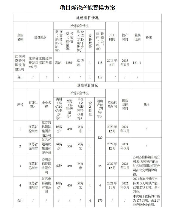 按照《国务院关于化解产能严重过剩矛盾的指导意见》、《国务院关于钢铁行业化解过剩产能实现脱困发展的意见》和《钢铁行业产能置换实施办法》要求,我厅自2022年12月27日至2023年1月29日对江阴兴澄特种钢铁有限公司高炉项目产能置换方案进行了公示,公示期间收到的异议已按程序进行了处理。现予公告,欢迎社会公众进行监督。