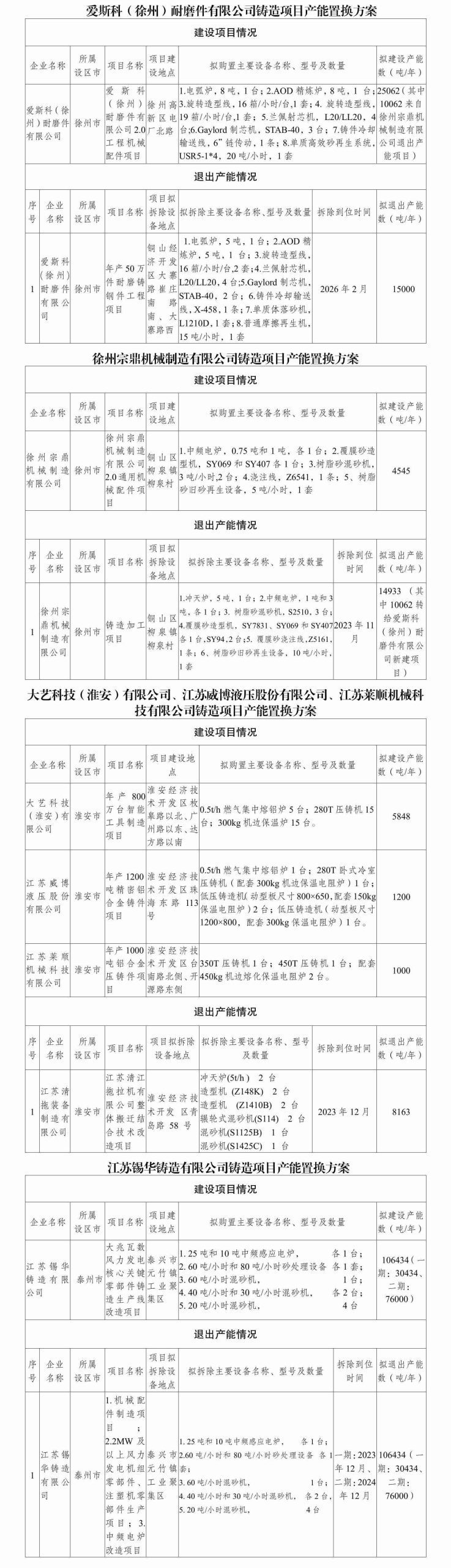 按照《国务院关于印发打赢蓝天保卫战三年行动计划的通知》(国发〔2018〕22号)、《工业和信息化部办公厅 国家发展和改革委员会办公厅 生态环境部办公厅关于重点区域严禁新增铸造产能的通知》(工信厅联装〔2019〕44号)要求,现将爱斯科(徐州)耐磨件有限公司等6家企业铸造项目产能置换方案予以公示,欢迎社会公众进行监督。公示期为2023年2月14日至2023年2月20日。如有异议,请在公示期内以书面形式向江苏省工业和信息化厅反映情况。联系电话:025-69652741(业务咨询)、025-69652843(信访举报)。