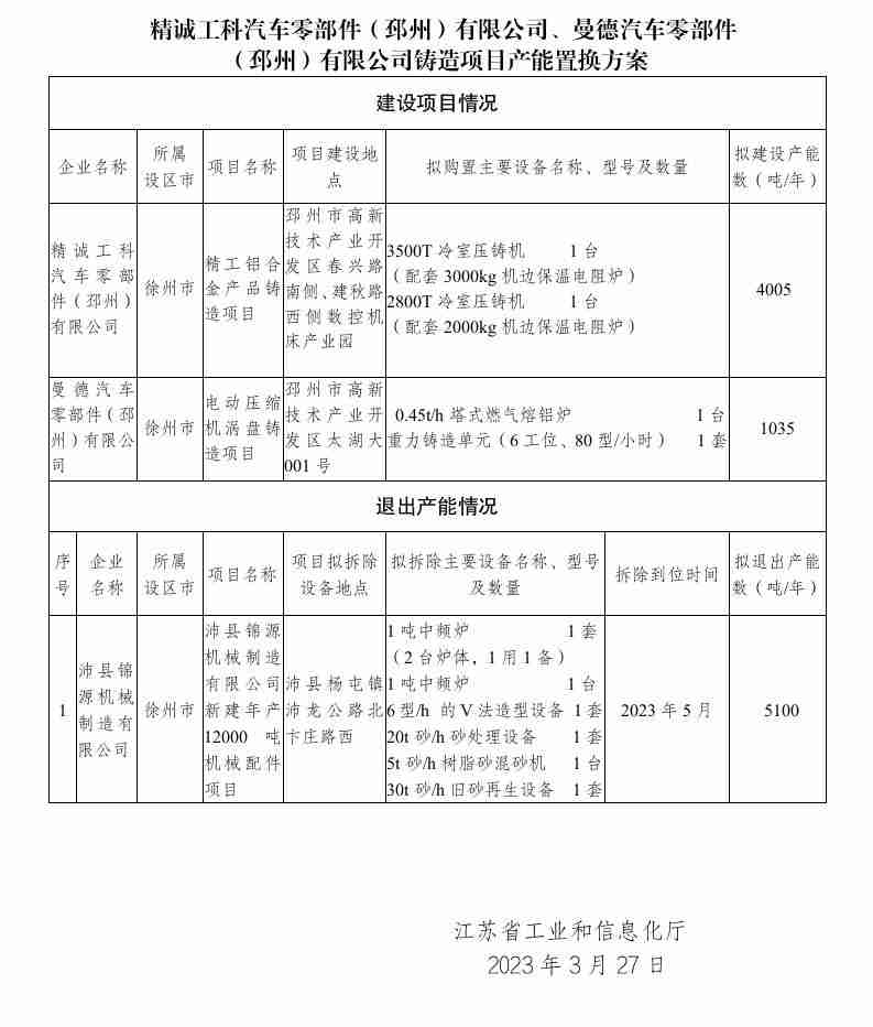 按照《国务院关于印发打赢蓝天保卫战三年行动计划的通知》(国发〔2018〕22号)、《工业和信息化部办公厅 国家发展和改革委员会办公厅 生态环境部办公厅关于重点区域严禁新增铸造产能的通知》(工信厅联装〔2019〕44号)要求,现将精诚工科汽车零部件(邳州)有限公司、曼德汽车零部件(邳州)有限公司等2家企业铸造项目产能置换方案予以公示,欢迎社会公众进行监督。公示期为2023年3月27日至2023年3月31日。如有异议,请在公示期内以书面形式向江苏省工业和信息化厅反映情况。联系电话:025-69652741(业务咨询)、025-69652843(省纪委监委派驻省工信厅纪检监察组)。