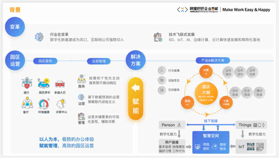 5、云前台:阿里通过自研智能机器,实现了线下各种服务的输出,包括报销、园区查询,一键保障,一键求救,一键呼叫客服,并且这样的服务可随着产品能力扩展不断叠加。同时还可以根据不同的园区诉求,不同办公场景的需求进行定制化服务。既高效提供服务,也大幅度减少了前台人员的编制。