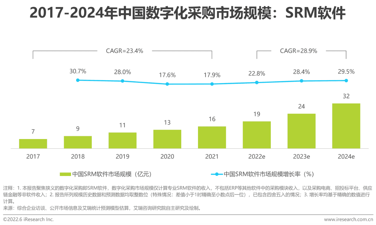 以SRM软件的收入口径核算目前已采买数字化采购软件的市场规模,2021年中国数字化采购市场规模达到16亿元,同比增长17.9%。考虑企业节流意识的不断增强,预计到2024年市场规模将达到32亿元,其中SaaS收入将成为市场增长的主要动力。