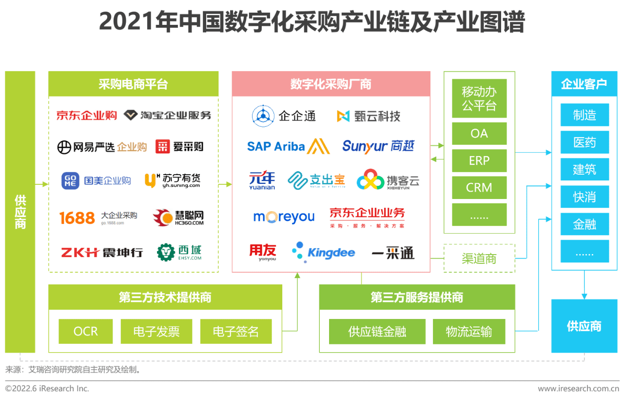 数字化采购的上游为企业的供应商,既包括企业自有供应商,也包括通过采购电商平台汇聚的海量外部供应商。数字化采购厂商作为产业链上的科技服务商,帮助企业对接供应商并提供采购管理的能力,一方面可以与OA、ERP等厂商合作,实现不同业务系统间的数据联通,一方面可以与供应链金融、物流运输等第三方服务商合作,共同赋能企业客户。