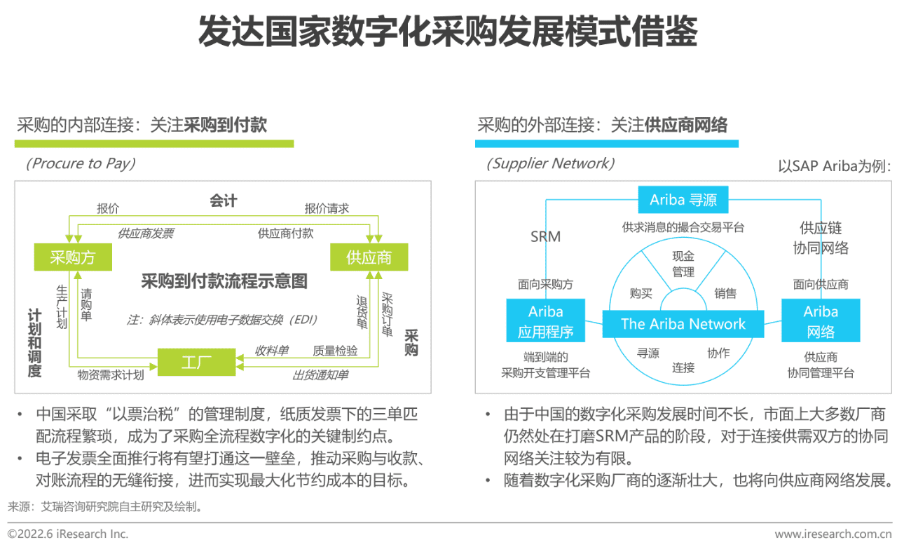 目前来看,中国与欧美等发达国家在数字化采购的整体发展路径上基本一致。与中国市场类似的,欧美发达国家的数字化采购同样以直接采购和间接采购作为划分,如Coupa专注于间接采购,SAP Ariba、JAGGAER等同时发力直接采购和间接采购。但不同之处在于,欧美的数字化采购起步更早,现阶段对于数字化采购的关注已经不再局限于企业采购动作本身,更加强调采购到付款和供应商网络的构建。