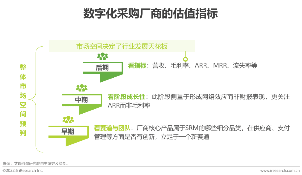 在对厂商的投资价值进行评估时,首先考量的是整体市场空间,随着中国对信息化水平提升与数字化转型的重视,企业数字化采购将迎来发展黄金期。其次关注的是赛道切分与阶段成长性,SRM涵盖了企业的核心交易环节,统筹核心物资及服务和非核心物资及服务的采购,与ERP、OA、CRM等系统相比有其特殊性,这也将成为赛道成长机会点。最后是关注投资指标,如营收、ARR(年度可重复订阅费)、毛利率等。