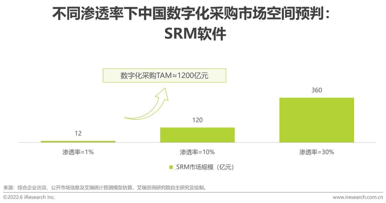 相比CRM、ERP等企业级软件,数字化采购尚处在发展的极早期阶段。中国SRM软件的潜在市场空间约1200亿元,当前渗透率仅在1%左右。随着数字化采购应用成熟度的提升,SRM软件将遵循由超大型企业向大型企业进而向中小企业渗透的路径。