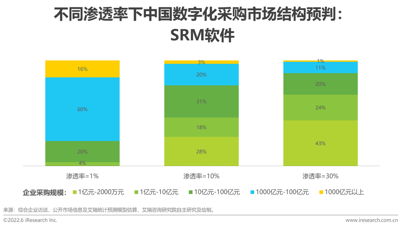 目前,中国应用SRM软件的企业基本上是采购规模在10亿元及以上的,其中规模100亿元以上的企业贡献了绝大部分的收入。根据艾瑞咨询测算,中国SRM软件的潜在市场空间约1200亿元,当前渗透率仅在1%左右。随着数字化采购应用成熟度的提升,SRM软件将遵循由超大型企业向大型企业进而向中小企业渗透的路径,预计到渗透率10%的时候,采购规模在10亿元以下的企业所贡献的收入将提升至近50%。