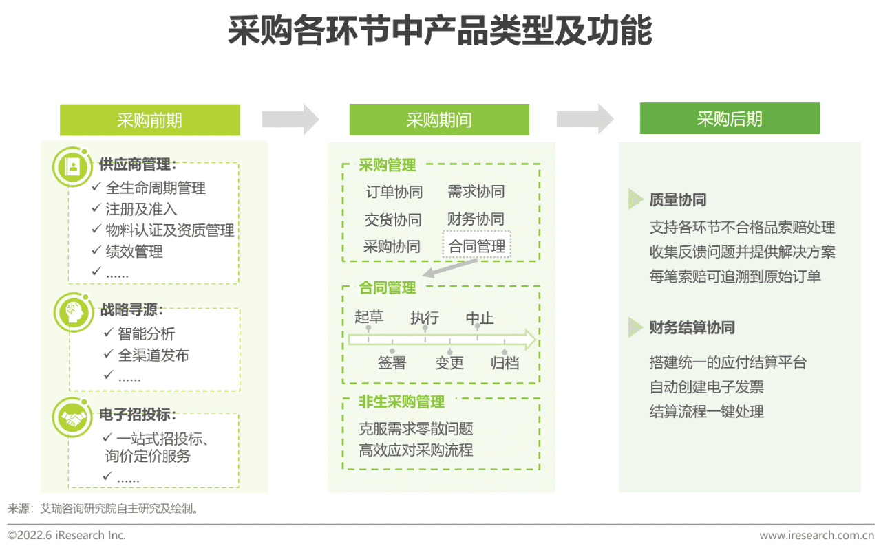 数字化采购体系致力于将采购的各个环节智能化规范化,缩短采购周期,帮助企业提升采购效率。在现有数字化采购行业中,产品已部署到采购链条的各个环节,从采购前的甄选、寻源到采购过程中的订单、财务、合同签署等环节,再到采购结束后的售后服务领域,产品线较为完整,有效剔除传统采购行业内的冗杂部分,使得供采双方高效便利地达成合作。