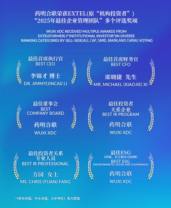全球领先的生物偶联药物合同研究、开发和生产企业(CRDMO)药明合联(WuXi XDC,2268.HK)今日宣布,公司在国际权威金融评选机构Extel(原《机构投资者》)”2025年度亚洲地区公司最佳管理团队(不含日本)”榜单中的六大投票类别均位居前列,包括:”最佳首席执行官”、”最佳首席财务官”、”最佳董事会”、”最佳投资者关系企业” 、”最佳投资者关系专业人员”、 “最佳ESG(环境、社会和公司治理)”。