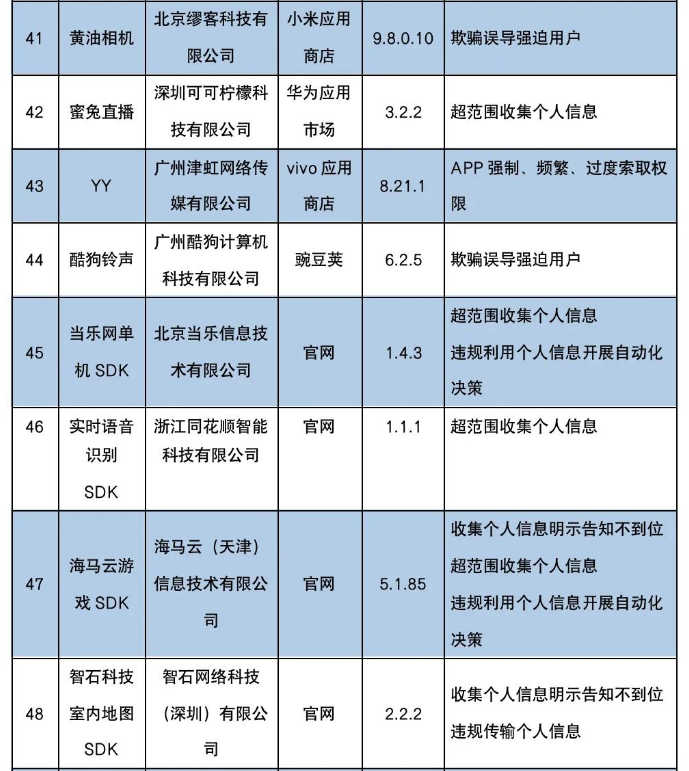 工业和信息化部高度重视用户权益保护工作,依据《个人信息保护法》《网络安全法》《电信条例》《电信和互联网用户个人信息保护规定》等法律法规,持续开展APP侵害用户权益专项整治行动。近期,我部组织第三方检测机构对群众关注的生活服务、休闲娱乐、实用工具等移动互联网应用程序(APP)及第三方软件开发工具包(SDK)进行检查。发现55款APP(SDK)存在侵害用户权益行为(详见附件),现予以通报。