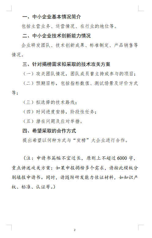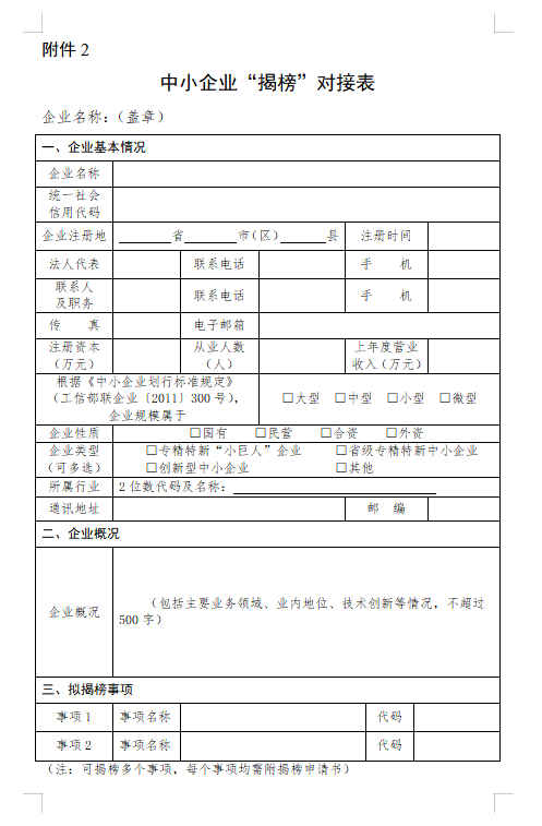 (二)组织中小企业“揭榜”。省级中小企业主管部门组织有意愿且符合《中小企业划型标准规定》(工信部联企业〔2011〕300号)的中小企业围绕大企业技术创新需求目录“揭榜”,在全国大中小企业融通创新服务平台填写《中小企业“揭榜”对接表》(见附件2),提交《中小企业“揭榜”申请书》(模板见附件3),打印纸质版并加盖企业印章,报送至省级中小企业主管部门。省级中小企业主管部门对材料初审后,报送至工业和信息化部,报送时间另行通知。