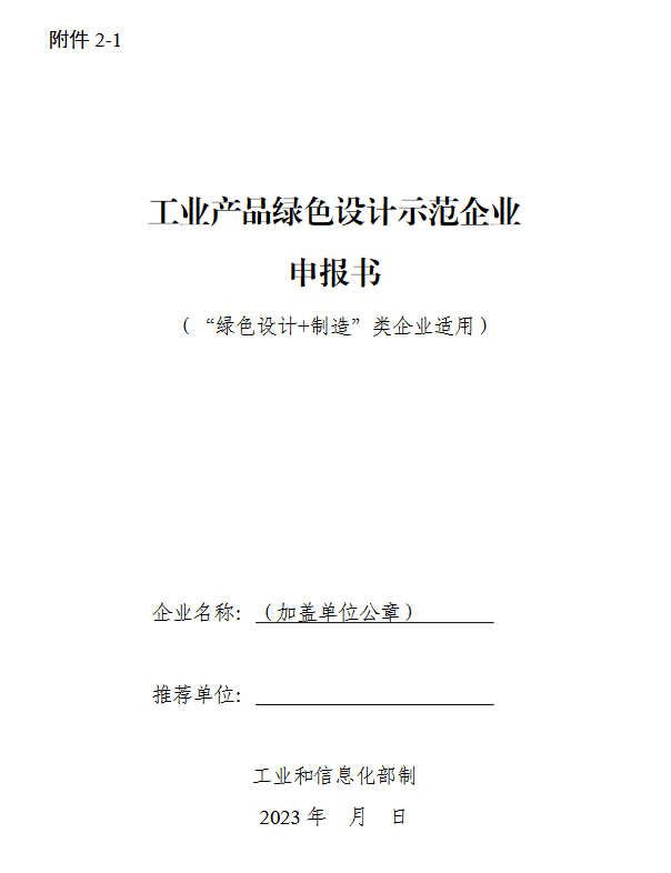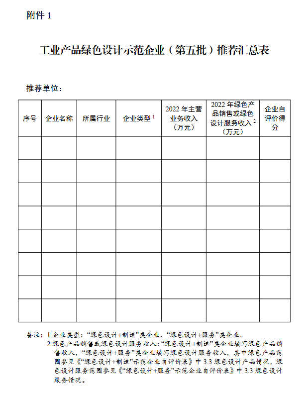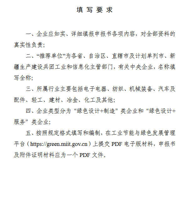 请各推荐单位于2023年6月30日前将推荐文件、工业产品绿色设计示范企业(第五批)推荐汇总表(附件1)、第五批工业产品绿色设计示范企业申报书(附件2)、工业产品绿色设计示范企业动态管理表(附件3)等电子版材料通过工业节能与绿色发展管理平台(https://green.miit.gov.cn)报送工业和信息化部(节能与综合利用司)。