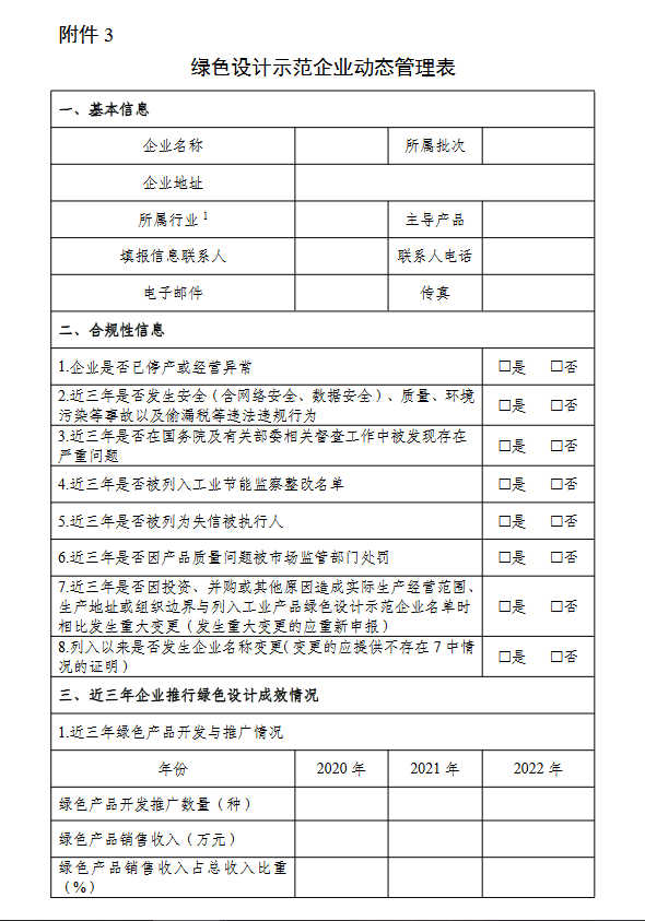 请各地工业和信息化主管部门、有关中央企业加强对示范企业的跟踪指导和服务,跟踪掌握工作进展,组织示范企业每年填报工业产品绿色设计示范企业动态管理表(附件3),做好动态管理审核并及时上报。工业和信息化部将加强对示范企业名单的监督管理,完善名单动态管理机制,对各单位上报的动态管理表进行评估,对不再符合示范企业要求的单位从名单中予以除名。