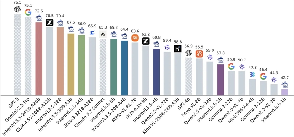 InternVL3.5的旗舰模型InternVL3.5-241B-A28B在多学科推理基准MMMU中获得开源模型最高分77.7分,多模态通用感知基准MMStar和OCRBench分别取得77.9分和90.7分,超越GPT-5(75.7分/80.7分)。文本推理基准AIME25和MMLU-Pro分别达到75.6和81.3分,全面领先现有开源多模态大模型。依托级联式强化学习框架,全系列模型推理性能相比上一代平均提升16.0分。其中,InternVL3.5-241B-A28B综合推理性能达到66.9分,超越上一代模型的54.6分以及Claude-3.7-Sonnet的53.9分,在数学推理、逻辑推理等复杂任务中表现突出。
