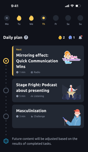这些guided training主要围绕工作相关目标展开,比如提升专业技能、领导力技能,以及发展公众演讲或演示能力。但Vocal Image还支持那些单纯想要增强自信的用户,以及LGBTQ群体,舒基乌拉娃曾在白俄罗斯为这一群体的权益奔走呐喊。