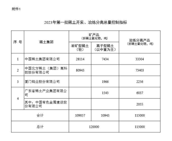 1. 2023年第一批稀土开采、冶炼分离总量控制指标