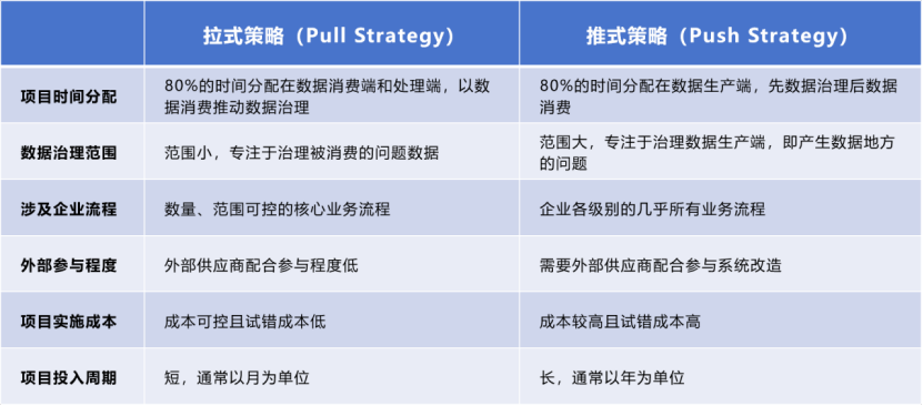 拉式策略以数据应用需求为起点,推式策略以标准规划为起点,两种策略在多个方面有差异: