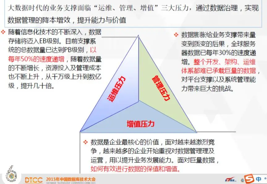 上图为某运营商从运维压力、管理压力、增值压力等角度进行叙述,如果说的浅显直白一点的话,数据治理最主要的动机来自2方面。数字化转型网www.szhzxw.cn