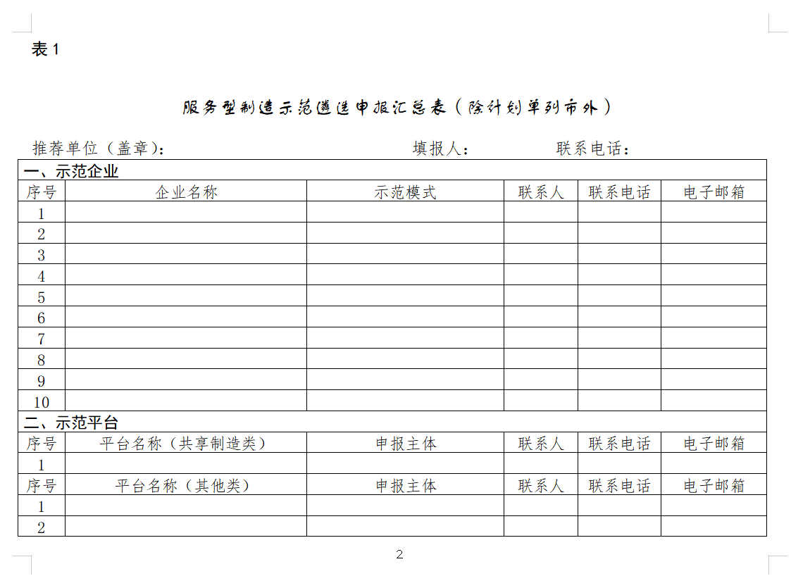 服务型制造示范遴选申报汇总表