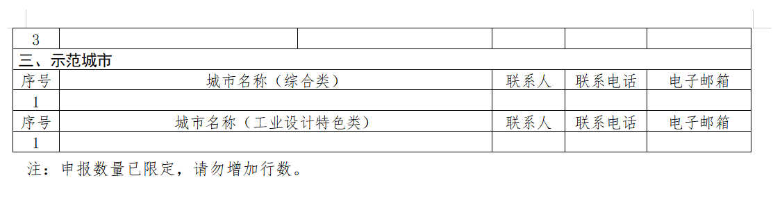 各省、自治区、直辖市工业和信息化主管部门可推荐综合类城市不超过1个、工业设计特色类城市不超过1个。计划单列市可申报综合类或工业设计特色类示范城市。已成为示范城市的无需再进行申报推荐。