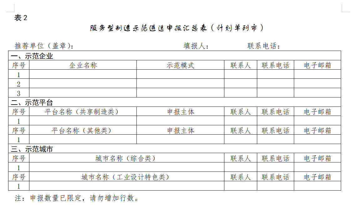 (三)省级主管部门对本地区所有申报材料进行初审,并按照推荐名额择优推荐。通过初审的申报主体,须下载申报书并加盖申报单位公章(示范城市申报书由所在城市人民政府盖章),报送省级主管部门。省级主管部门对本地区申报材料进行汇总、审核后,加盖推荐单位公章,并填写“服务型制造示范遴选申报汇总表”(附件2)。各省级主管部门于2023年5月31日前,将第五批申报汇总表、相关申报书(一式1份)报送我部(产业政策与法规司)。