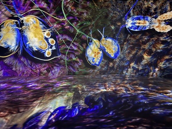该空间以”宇宙共鸣箱”为设计理念,构建了一个全包围六面投影的540°沉浸式视听空间。观众走进展厅,不再是旁观者,而成为了”共鸣体”的一部分,在动态光影与环绕音效中全身心感受影像的魅力。通过13台FP-ZUH6000投影机的多机联动,实现了六面墙体与地面的巧妙衔接与超广视角投影,创造出一种无限延伸的错觉:一望无际的海洋、层次分明的洞窟空间、壮观的火山喷发、如同万花镜一般无限延伸旋转的城市……在这里,影像的边界被打破,万物之光在空间中交织、碰撞、共鸣,为观众带来一场从物理空间到精神世界的沉浸之旅。