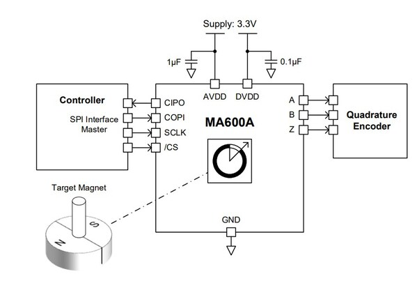 MAQ600A有多种接口可供选择,包括用于数字角度读取和芯片配置的串行外设接口 (SPI),用于数字角度读取的同步串行接口 (SSI),脉冲数可配置为 1–4096的增量ABZ 正交编码器接口,增量 UVW 编码器输出,脉宽调制 (PWM) 绝对输出,支持多圈或速度输出选项。